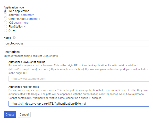необходимо указать тип клиента Web Application. Адрес перенаправления имеет