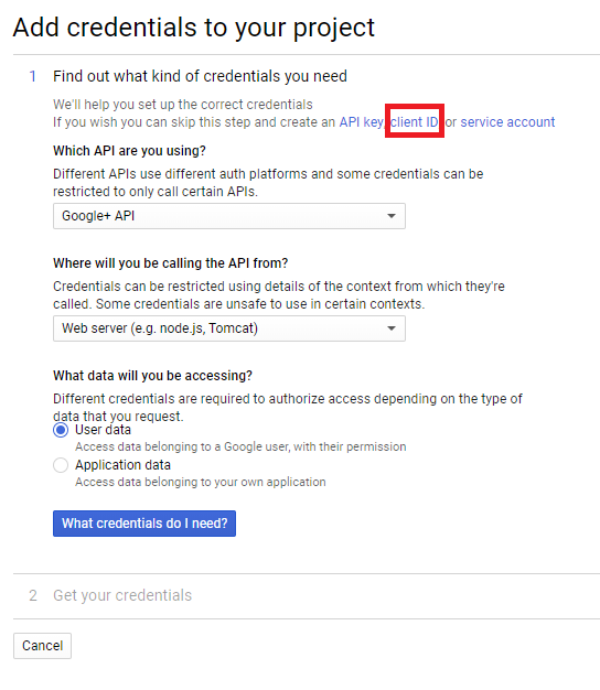 В появившемся мастере можно сразу перейти к настройке Client Id, нажав на ссылку client ID в первом пункте