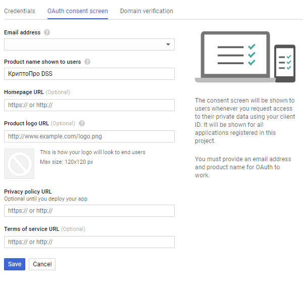 Прежде чем ввести параметры OAuth клиента, требуется задать данные, отображаемые на экране согласия (consent screen). На этом экране пользователю будет предложено предоставить доступ серверу к запрашиваемым данным при аутентификации. Обязательными для заполнения являются адрес электронной почты владельца сервера и отображаемое название сервиса.