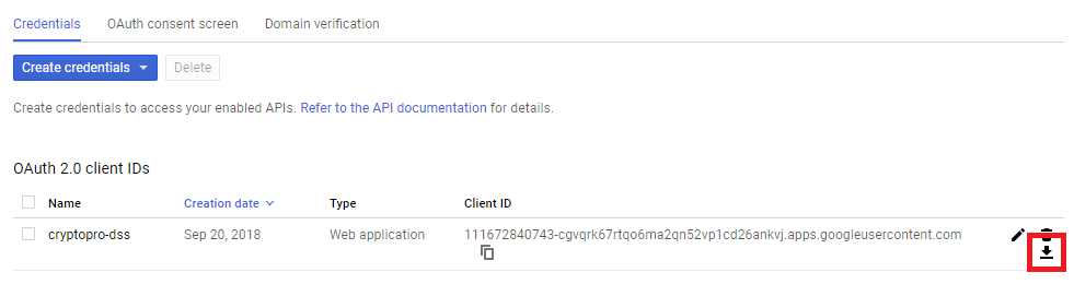После создания клиента появится диалог, отображающий присвоенный client_id и client_secret, данный диалог можно игнорировать. Вместо этого удобно скачать параметры подключения в виде JSON-документа.